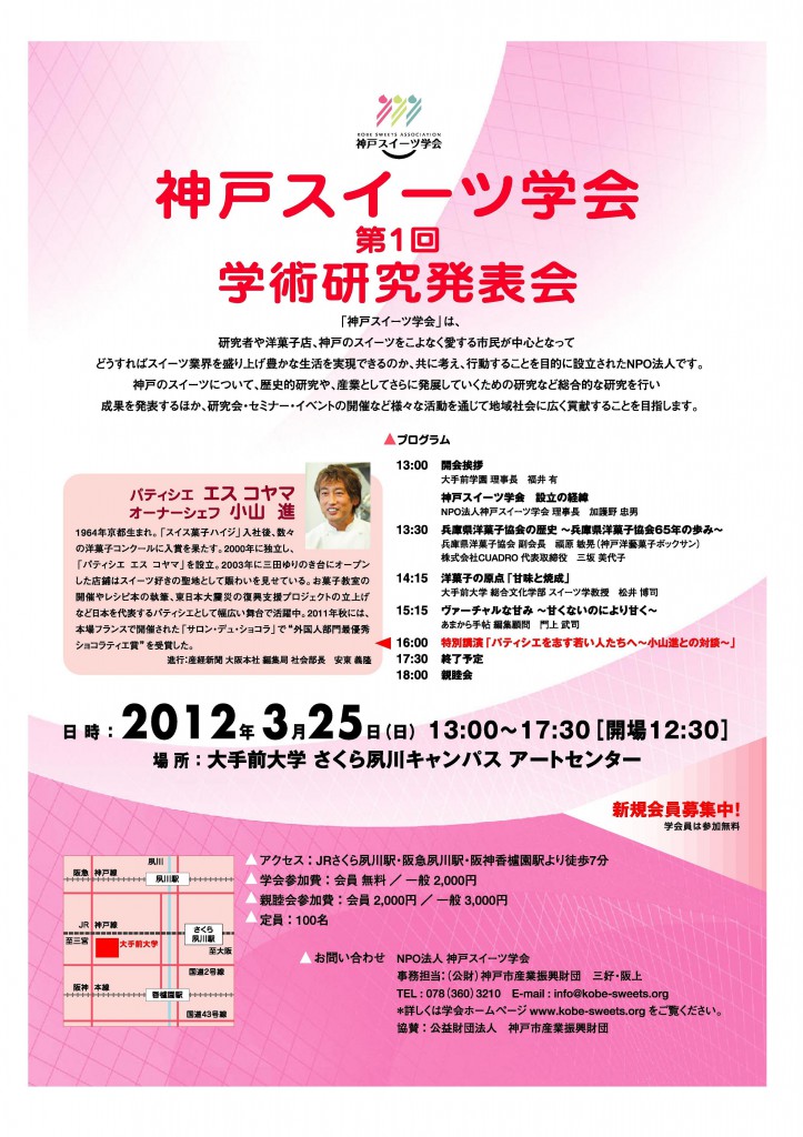 パティシエやスイーツ学の研究者を目指す人たちの育成のために、 特別講演としてパティシエ エス コヤマの小山進シェフにものづくり・ひとづくりに対する熱いメッセージをお話ししていただきます。 br 学会の終了後は協賛企業によるスイーツ盛りだくさんの親睦会を行いますので、 こちらも併せてお楽しみください。 payday loans 様々な立場でスイーツにかかわる人の交流から、業界を盛り上げる新たな動きが生まれることを願ってやみません。 br 参加者が共に考え、行動する「スイーツ学会」にぜひ足をお運びください。 br online payday loans no credit check 【神戸スイーツ学会 第1回学術研究発表会】 payday loan ■日 時: http://paydayloansusca.com 3月25日(日) 13:00~17:30 ■定 員: 100名 ■場 所: 大手前大学 さくら夙川キャンパス アートセンター 〒662-8552 兵庫県西宮市御茶家所町6-42 ■学会 参加費: 会員 無料/一般 2000円 payday express ■親睦会参加費: 会員 2000円/一般 3000円br br ■プログラム 11:00~ 総会(会員のみ) 13:00~ 開会挨拶 13:30~ 発表①:兵庫県洋菓子協会の歴史 兵庫県洋菓子協会 副会長/神戸洋藝菓子ボックサン 福原 敏晃 進行:関西スイーツ 代表 三坂 美代子 *当日「兵庫県洋菓子協会65年史」を特別価格4,000円にて頒布いたします。 payday loans online 14:15~ 発表②:洋菓子の原点「甘味と焼成」 payday the heist 大手前大学 総合文化学部 スイーツ学教授 松井 博司 15:15~ 発表③:ヴァーチャルな甘み~甘くないのにより甘く~ あまから手帖 編集顧問 門上 武司 16:00~ 特別講演:パティシエを志す若い人たちへ~小山進との対談~ パティシエ エス コヤマ オーナーシェフ 小山 進