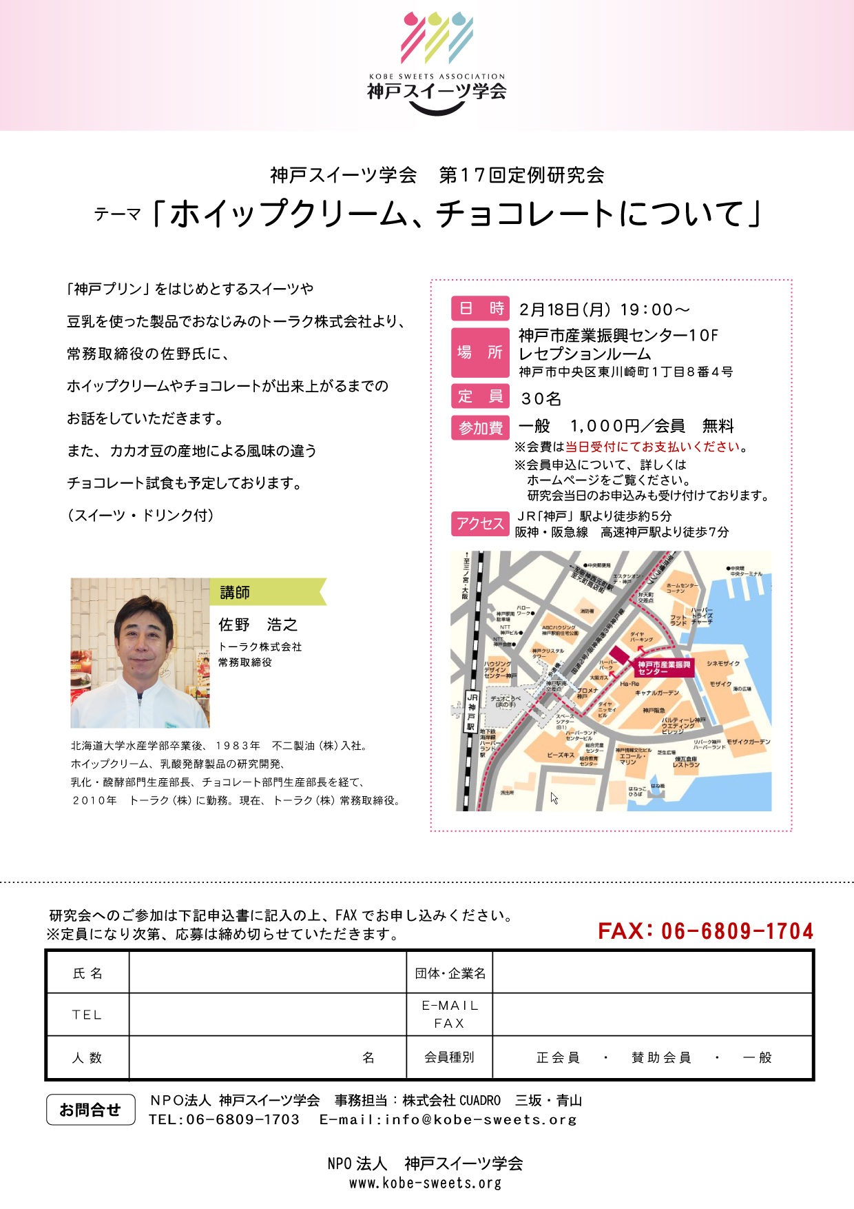 br 神戸スイーツ学会 第17回定例研究会 「ホイップクリーム、チョコレートについて」 br ■チラシ・申込書のダウンロードはこちら 【神戸スイーツ学会 第17回定例研究会】 ■日 時: 2月18日(月) 19:00~20:30 ■定 員: 30名 ■場 所: 神戸市産業振興センター10Fレセプションルーム ■学会 参加費: viagra on ebay 会員 無料/一般 1000円 ■プログラム 「神戸プリン」をはじめとするスイーツや豆乳を使った製品で おなじみのトーラク株式会社より、常務取締役の佐野氏に、 ホイップクリームやチョコレートが出来上がるまでの お話をしていただきます。また、カカオ豆の産地による風味の 違うチョコレート試食も予定しております。     トーラク株式会社 オフィシャルサイト